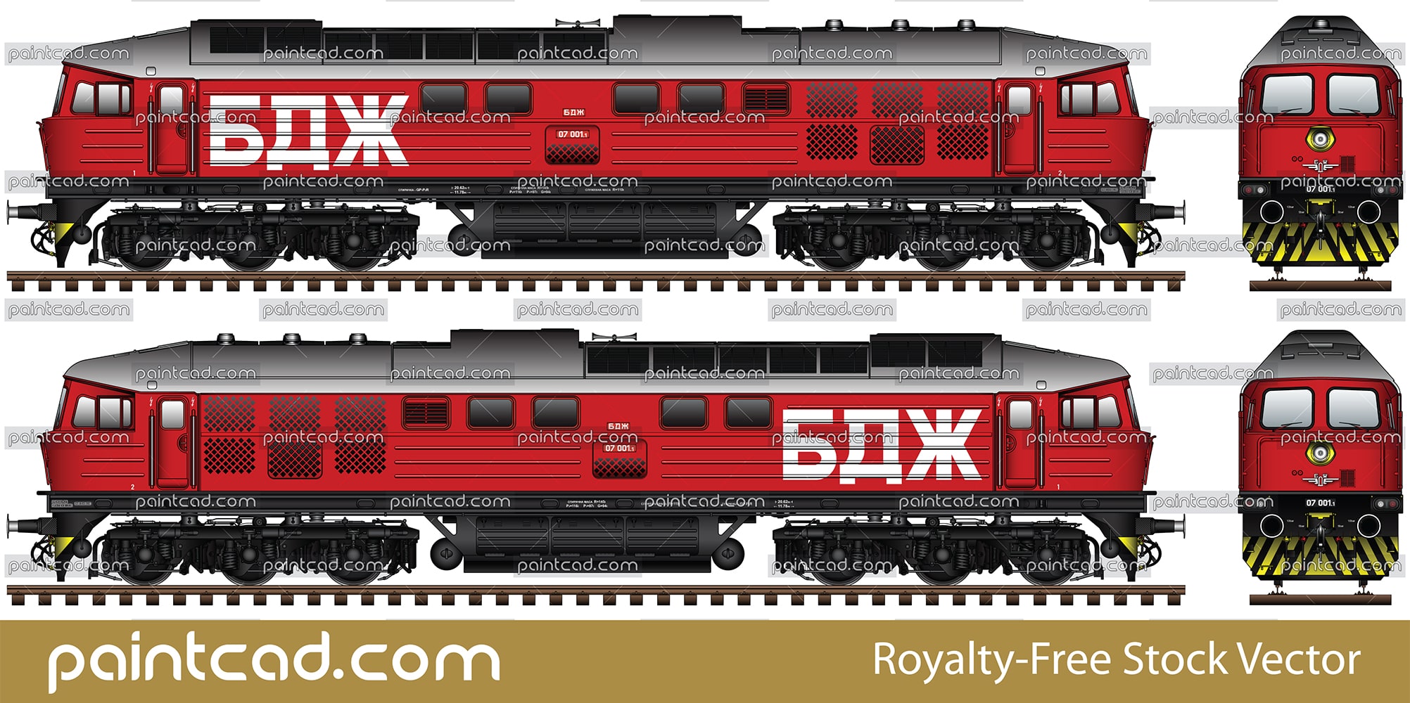 Side and front view with Soviet diesel-hydraulic locomotive in red livery and logo of BDZ. The engine is known as serie 07 in Bulgaria. Locomotive is built by the factories in Lugansk and designed to serve passenger and freight trains. EDITORIAL USE