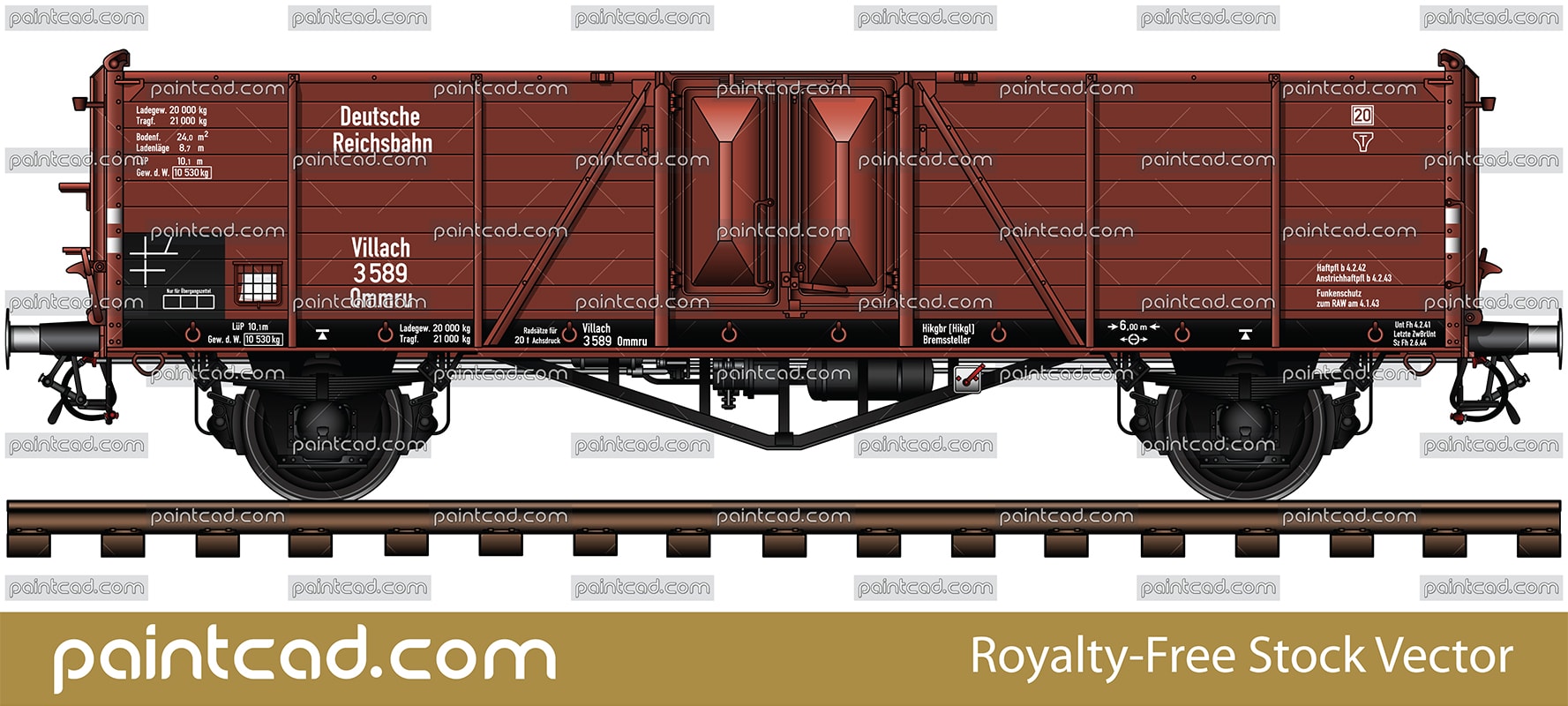 Vector illustration with side view of cargo car for transport of bulk goods, coal, scrap, steel and wood. Manufactured en masse from 1939 to 1945 in Germany and was used for the needs of the Third Reich. Carriage of goods relatively resistant to weather conditions. Reporting mark DR, Villach, Ommru.