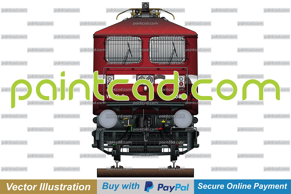 Vector illustration with front view of electric locomotive class WAG-9 with unique red livery, designed by Mr. Samit Roychoudhury - а longtime member of the Indian Railways Fan Club Association (IRFCA), cartographer and author of famous atlas book “The Great Indian Railway Atlas“. A WAG-9H engine is heavier variant of the WAG-9. EDITORIAL USE