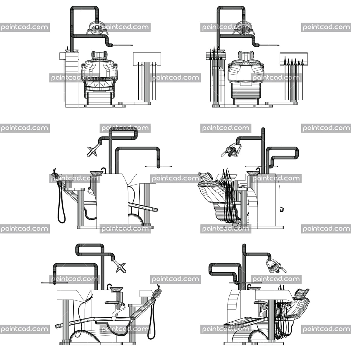 Vector drawing with wire model of dental chair. Front, rear, side and axonometric polygonal view. Three-dimensional graphic design. Isolated objects on white background.