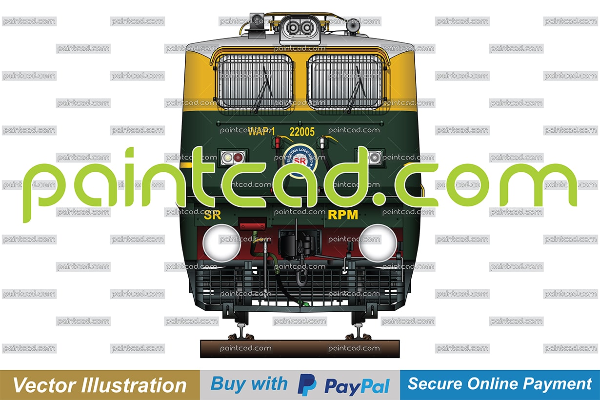 Vector illustration with front view of passenger electric locomotive WAP-1 used by the South Indian Railway Company. Equipment - two Stone India (Calcutta) AM-12, frame frontal plow, AAR tightlock couplers and chain link couplers. The machine is painted in Sapthagiri livery. EDITORIAL USE