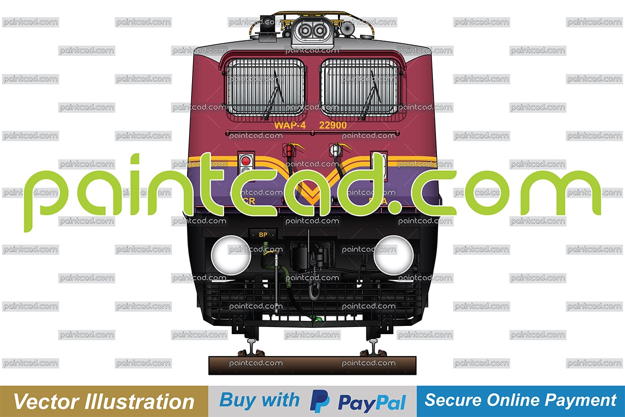 Vector illustration with front view of passenger electric locomotive WAP-4 used in Indian Railways. Unique livery in cyclamen-purple color and yellow stripes used by Vijayawada electric loco shed. Abbreviation WAP-4 mean: W - Broad Gauge, A – AC electric traction, P – Passenger and “4” - the serial number of the engine. EDITORIAL USE