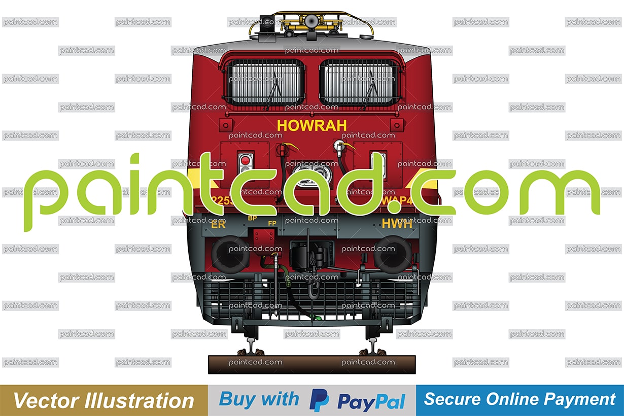 Vector illustration with front view of passenger electric locomotive WAP-4 used in Indian Railways. The engine is equipped with pantographs Two Stone India "Calcutta" AM-12. Detailed color drawing with all inscriptions in English for railway company, machine type and serial number. EDITORIAL USE
