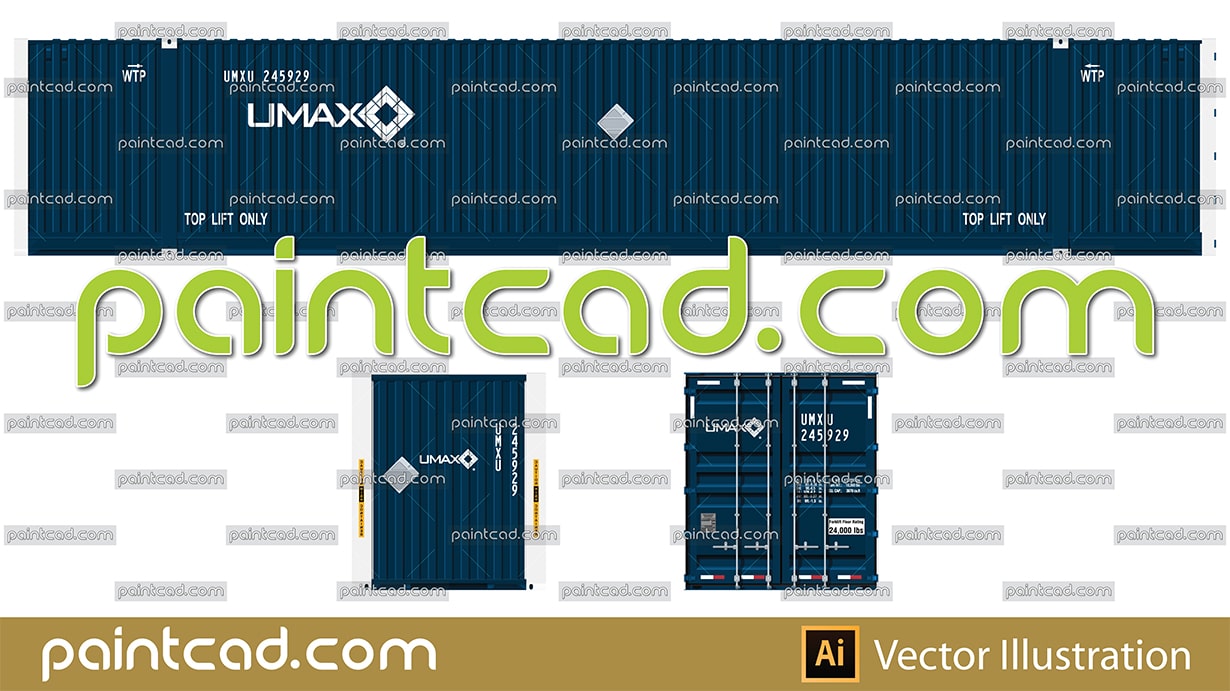 Side and front view with intermodal container 53 ft. Details- dark-blue livery, all technical inscriptions and designations, doors with hinges, CSC- Convention for Safe Containers plate for international transport and lifting slots. Reporting mark and logo of the UMAX container program. EDITORIAL USE