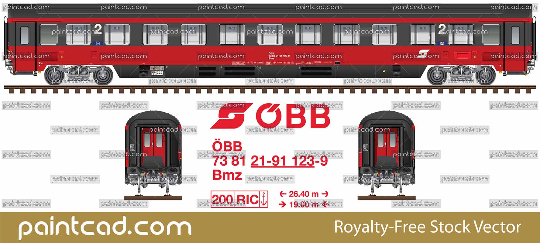 Side and front view with passenger wagon Bmz. A rolling stock of ex-train "Mozart" with route from Paris to Vienna via Strasbourg. All technical inscriptions and designations are under the UIC classification of railway coaches. Classic "Pflatsch" logo of the Österreichische Bundesbahnen. EDITORIAL USE
