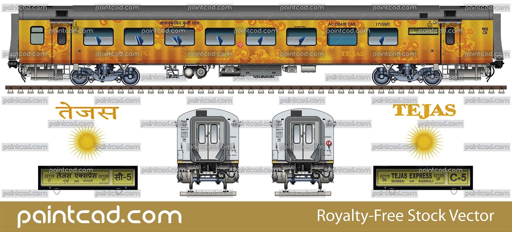 Side and front view with luxury Indian Linke Hofmann Busch coach. Details- futuristic yellow livery with anti-graffiti vinyl wrapping, automatic doors with rubber protectors, destination boards, all technical inscriptions in Hindi and English. Reporting mark - CR - मध्य - Central Railway. EDITORIAL USE
