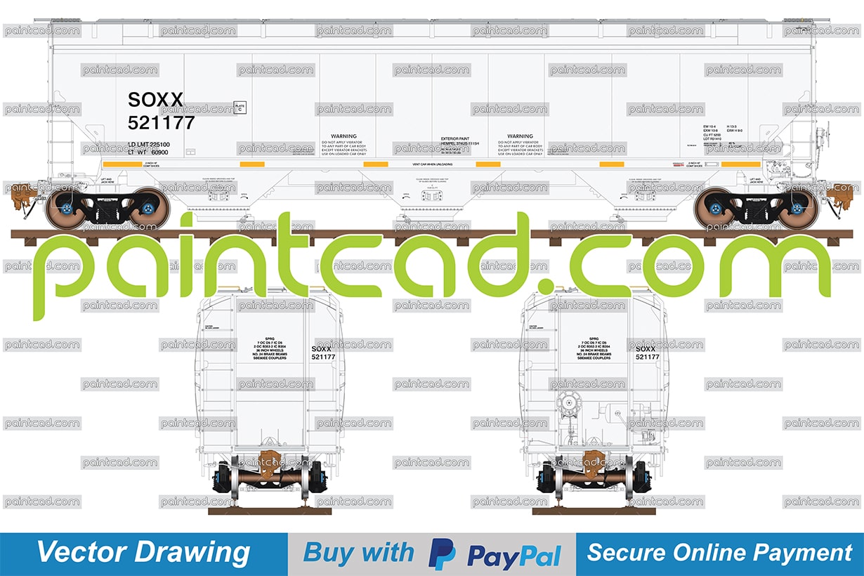 Color technical diagram of modern hopper railcar. Side, front and back view. Reporting mark SOXX. Builder Gunderson-Gimsa, Monclova, Mexico. EDITORIAL USE