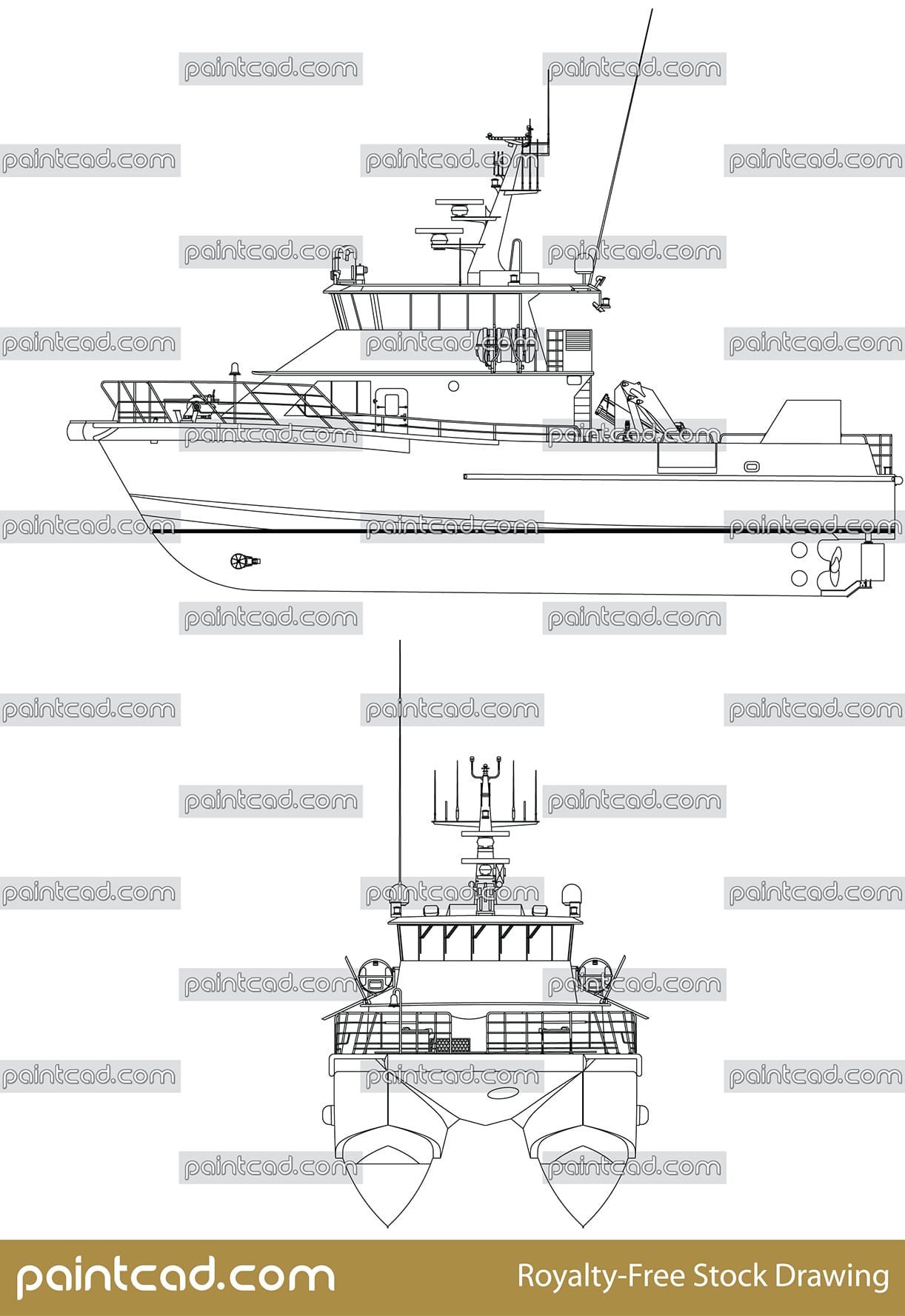 Vector illustration of tourist vessel made with AutoCAD - side and front view. Ship has 21 meters length, additional escape ladder and broadened stairs on main deck. Technical diagram with high quality.