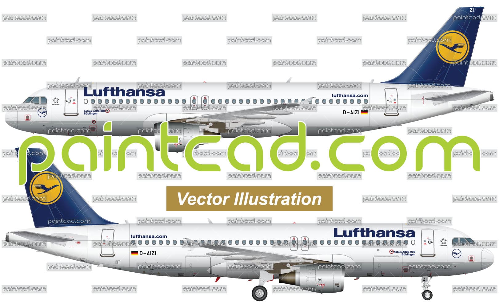 Left and right panoramic view of passenger plane in flight and on the ground. Reporting mark D-AIZI. Böblingen inscription and "Star alliance" logo on fuselage. Old paint scheme livery. Realistic and high-detail vector graphics made by real photos. EDITORIAL USE