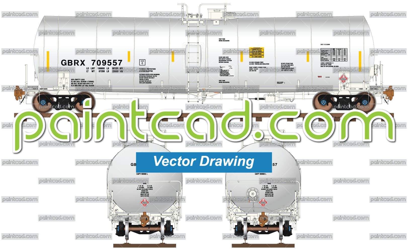 Side, front and rear view of modern railroad cistern with capacity 25,610 gallons. Main safety improvements- shell with full height frontal shields, thermal protection, fiberglass insulation and different loading-unloading valve configurations. A placard with UN number 2055 and hazard class 3. Reporting mark GBRX. EDITORIAL USE