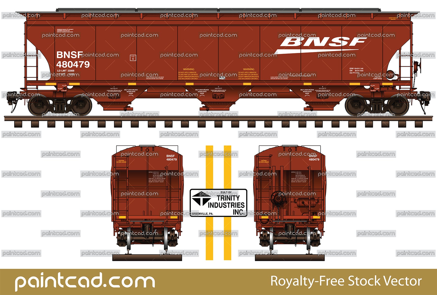 Side and front view of railroad 3-bay covered hopper car built by Trinity Industries Inc. Red livery of Burlington Northern Santa Fe Railway. Details - technical parameters, yellow marks, inscriptions, instructions for safe handling and hand brake. EDITORIAL USE