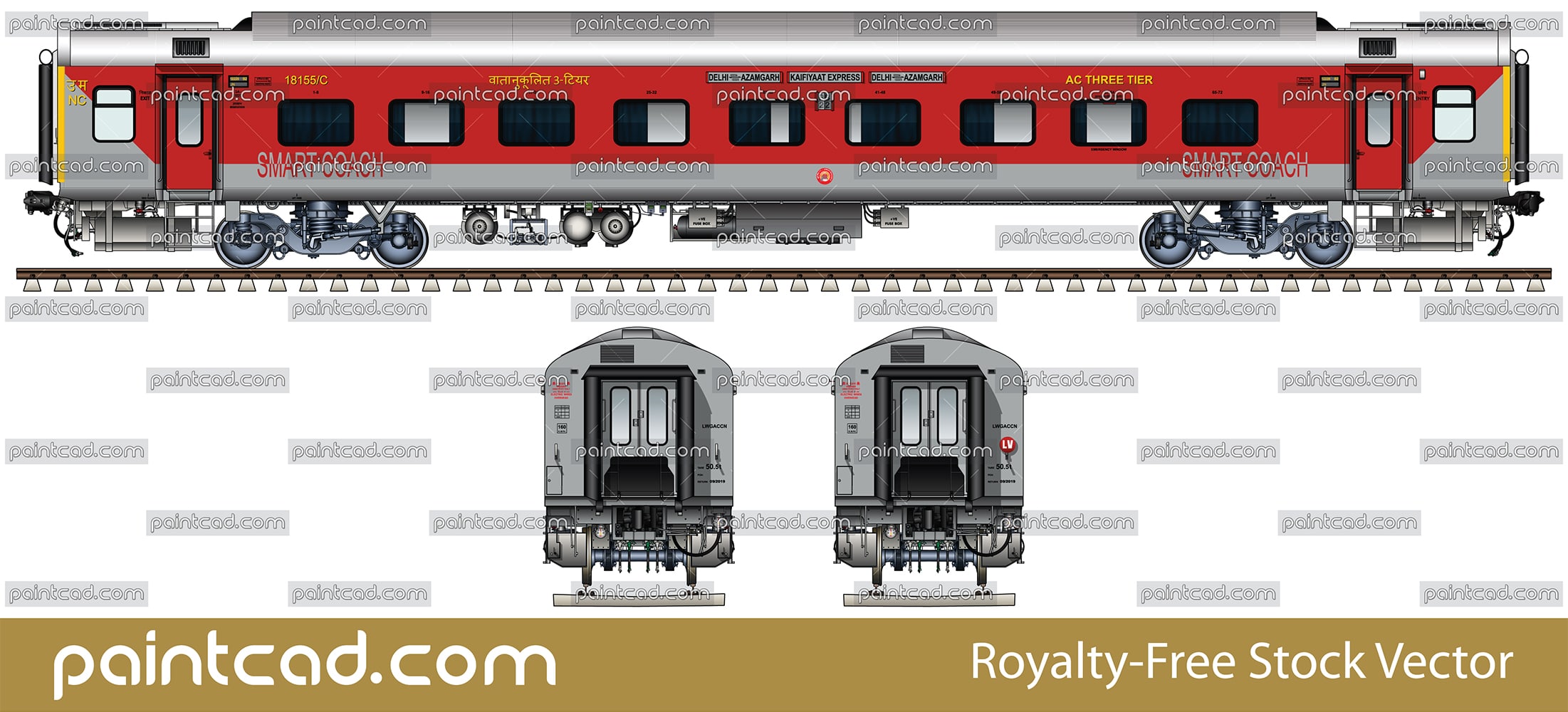Side and front view with new generation Air-Conditioned 3-tier coach. Car known as "wagon with brain" in Indian Railways. Details- vibration sensor on axles of bogies, electronic passenger info plates, water pumps, water indicator, Fiat bogies, all inscriptions in Hindi and English. EDITORIAL USE