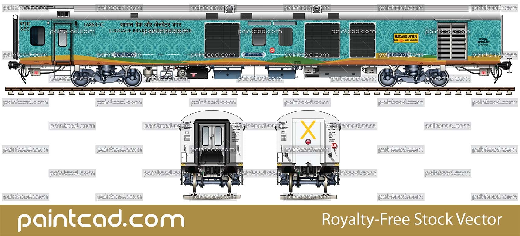 Side and front view with "Luggage, brake and generator car" in futuristic vinyl livery of Indian Railways. Details - yellow route plate with text Durg - Hazrat Nizamuddin, reporting mark SEC - South East Central Railway zone, IR circular logo, all technical inscriptions in Hindi and English, and others. EDITORIAL USE