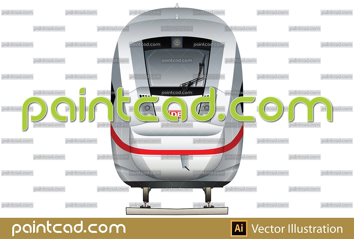 High-speed passenger train for long-distance used by Deutsche Bahn AG (The German Railways) - front view. Standard track gauge 1 435 mm and maximum speed 250 km/h. Details - wheels, lights, logo of DB and red horizontal stripe. High-quality vector icon suitable for infographic design. EDITORIAL USE