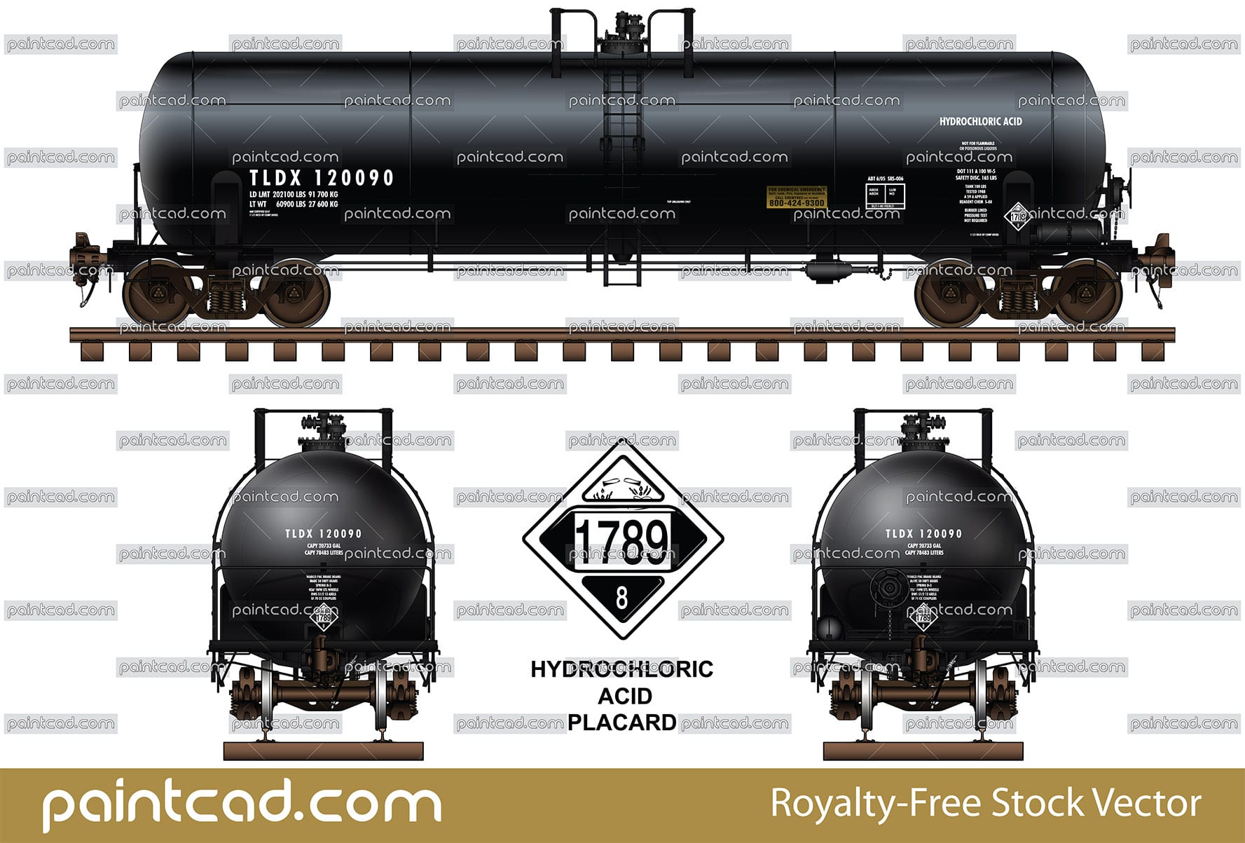 Side and front view with railroad tank car DOT 111 A 100 W-5 for transport of hydrochloric acid. Reporting mark TLDX - GE Capital Railcar Services. Color drawing with all technical inscriptions and signs for dangerous goods. EDITORIAL USE