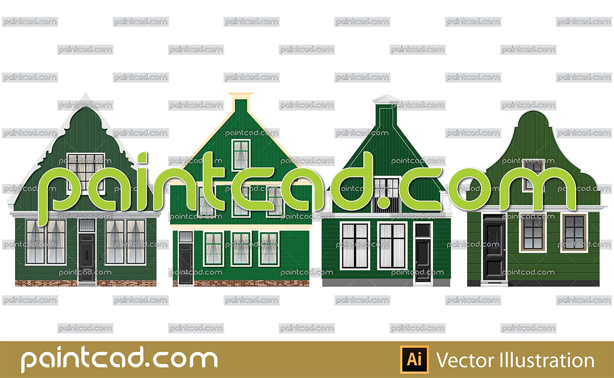 A set of facades of old wooden houses located around the river Zaan, Netherlands. These are known as Zaanse facades. They are painted in green and extends over Zaanstad and Zaanstreek. Different gables. Vector icons.