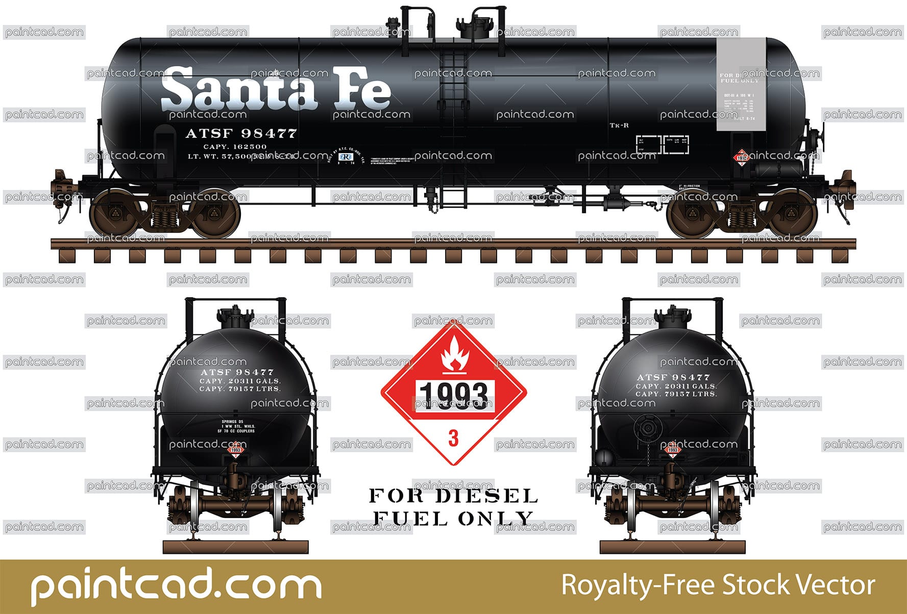 Side and front view with railroad cistern DOT 111 A 100 W 1 for transport of diesel. General service tank car 20,900 Gallon. Reporting mark ATSF and classical black painted livery. Color drawing with all technical inscriptions and signs for dangerous goods. EDITORIAL USE