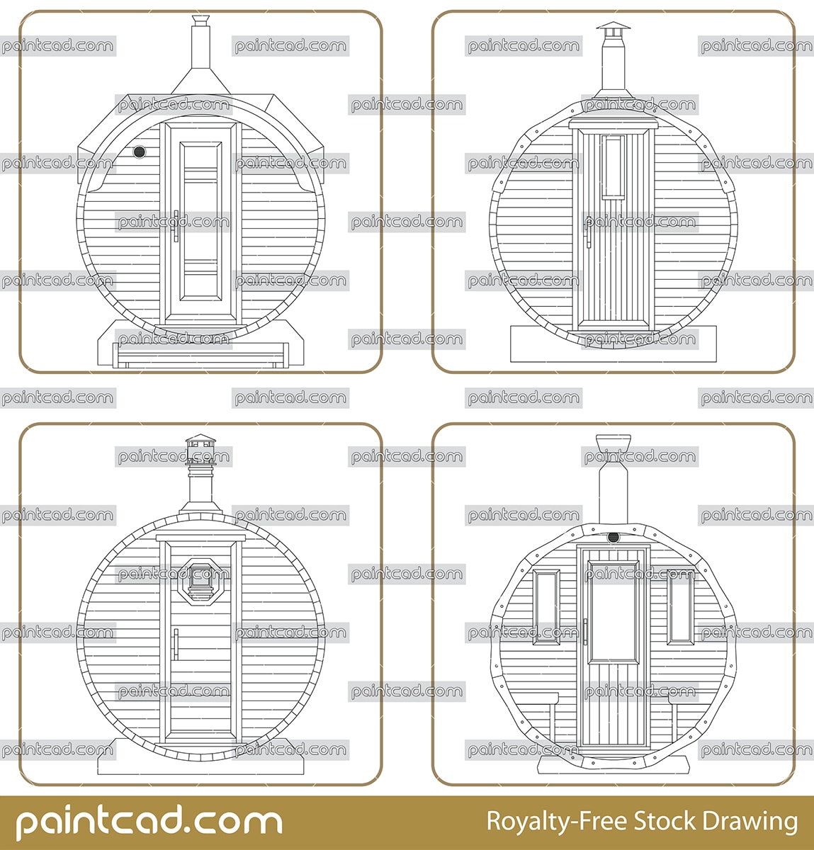 Vector set with four icons of exterior sauna - front view. Spa and wellness - wooden constructions. Illustration easy can be modified or colored.