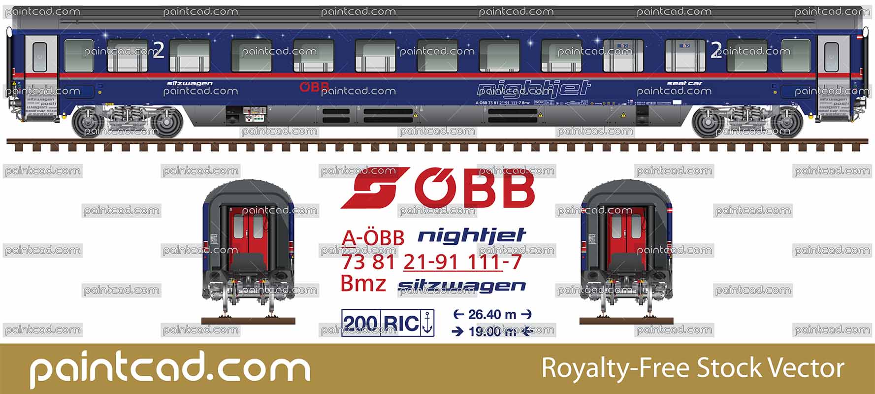 Side and front view with Austrian abteilwagen Bmz type. Second class sitzwagen "Eurofima". Realistic color drawing with all technical inscriptions and designations under UIC. Logo of the Österreichische Bundesbahnen - ÖBB. Stylish dark-blue livery with horizontal red-gray bands. EDITORIAL USE