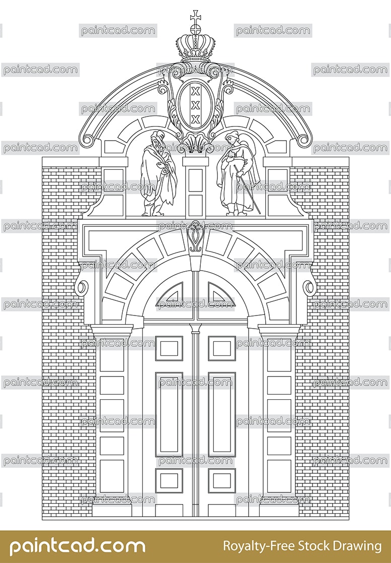 Drawing with a massive entrance gate from 15th century in front of the Het Leprozenhuis also known as Lazarus Huis, Sint Anthony Gasthuis - House for mentally ill people. The door is located at the corner of Lazarussteeg and Jodenbreestraat streets near to South Church in Dutch capital.
