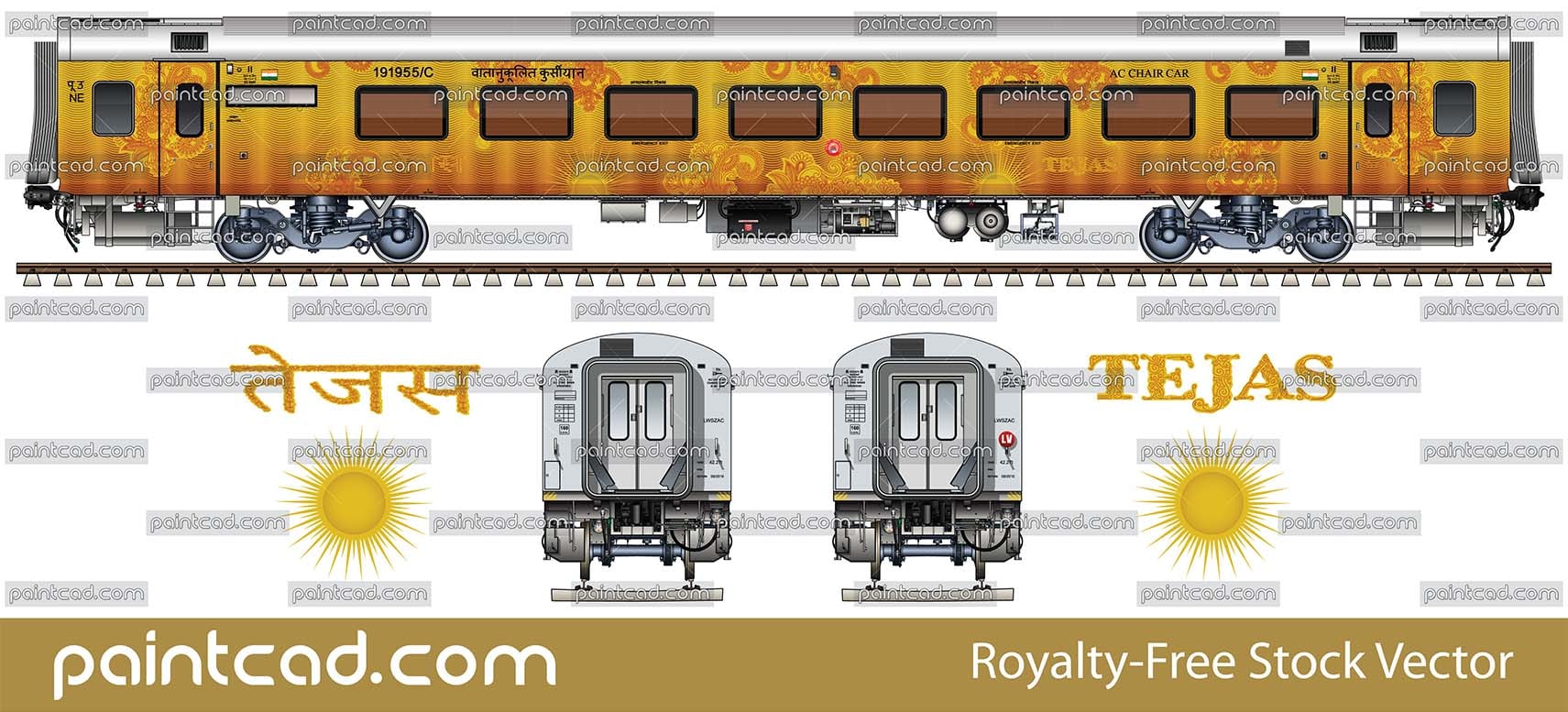 Side and front view with Indian LHB Air-Conditioned chair coach. Yellow livery with anti-graffiti vinyl wrapping and all technical inscriptions. High-speed passenger wagon from the express train 12585 Lucknow-New Delhi. Reporting mark NE - North Eastern Railway zone of Indian Railways. EDITORIAL USE