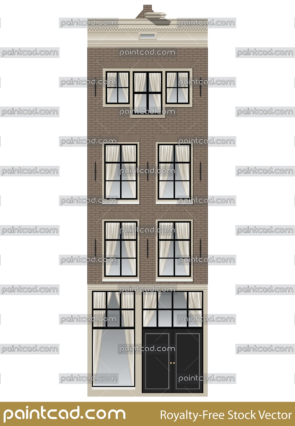 Colored an architectural facade of urban house from the center of Amsterdam city, Netherlands. Classic Lijstgevel with decorative cornice all over the facade. Such layout shows that this building is from the 19th century. The gable roof is visible above the frontal cornice.
