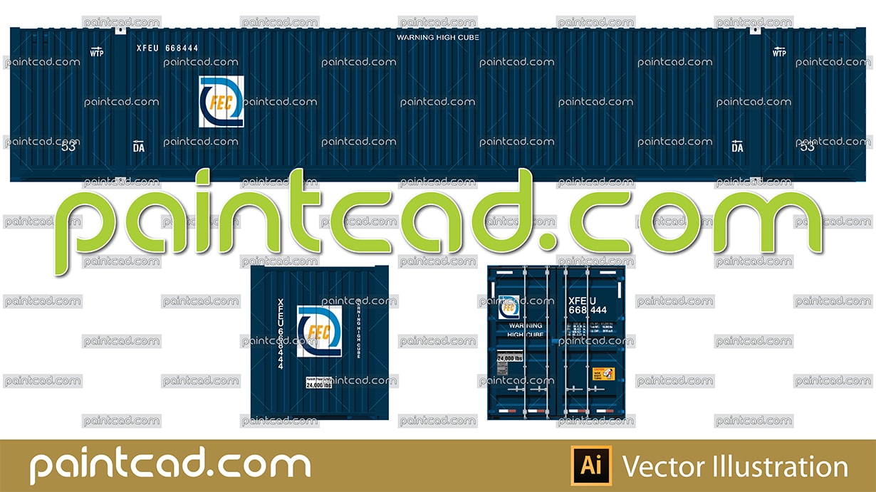 High Cube 53' long shipping container painted in blue. Side and front view. Details- all technical inscriptions and designations, doors with hinges, FEC Railway logo, CSC (Convention for Safe Containers) plate for international transport and lifting slots. EDITORIAL USE