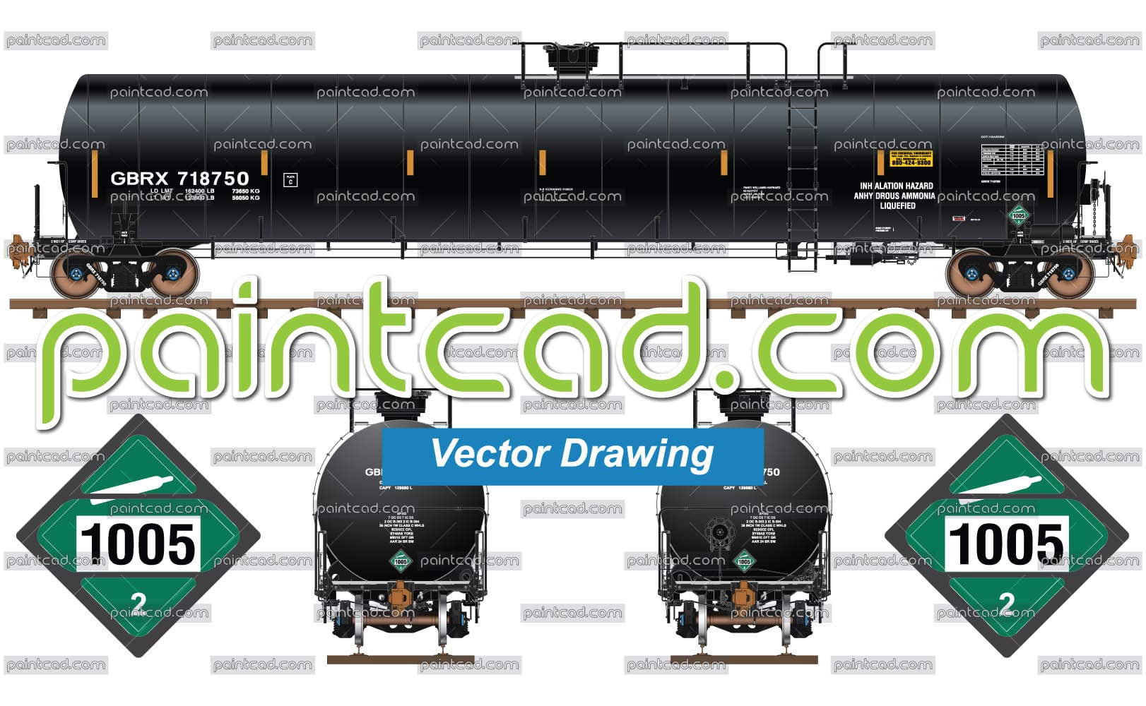 Side, front and rear view of modern railroad cistern for transportian of hazardous materials. The car is built to a DOT 112A500W specification. Capacity 34 311 gallons. Designation with the placard UN number 1005. Inscription for liquefied gas and danger of inhalation. Reporting mark GBRX - Greenbrier Leasing Corporation. EDITORIAL USE