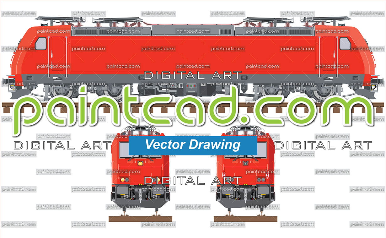 Flat infographic design with engine for hauling of the freight trains. Side and front modern view without black outline lines of the shapes. Clean and easily editable digital art without any gradients. The colored draft is very suitable for clipart, information icons, presentations, application buttons, technical projects, etc.