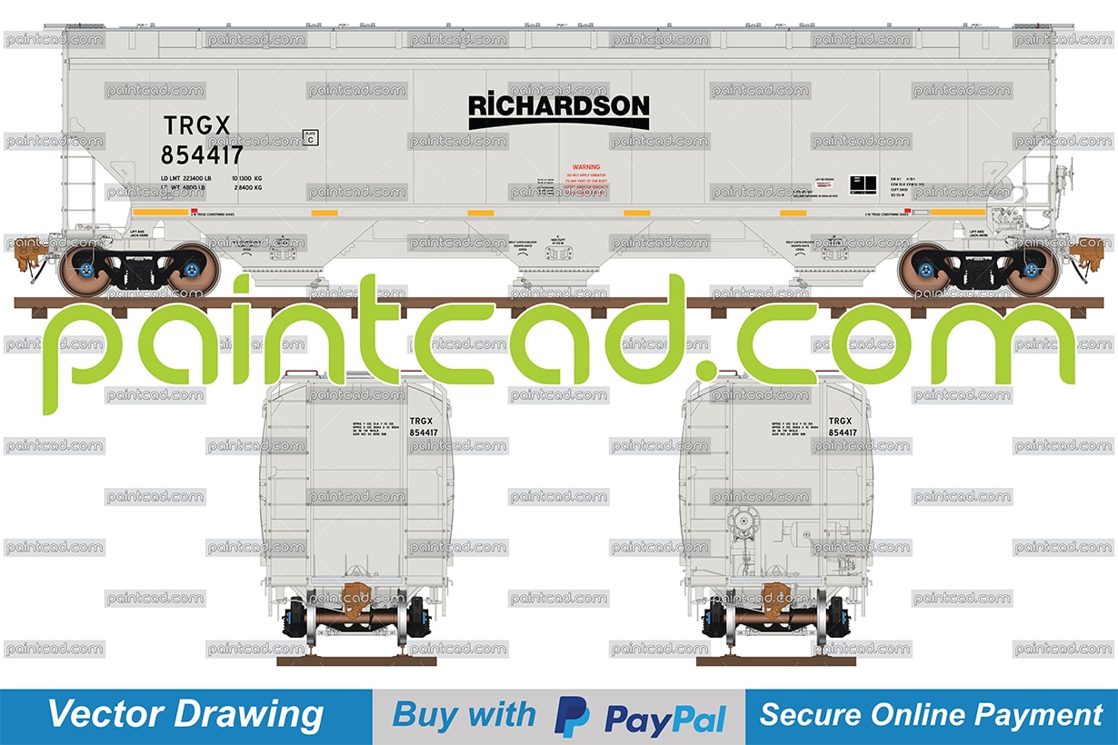 Color drawing with hopper railcar for transport of grain. Side, front and back view. Reporting mark TRGX- Terminal Grain Corporation. Diagram with all technical parameters, marks, inscriptions and instructions for safe handling. EDITORIAL USE