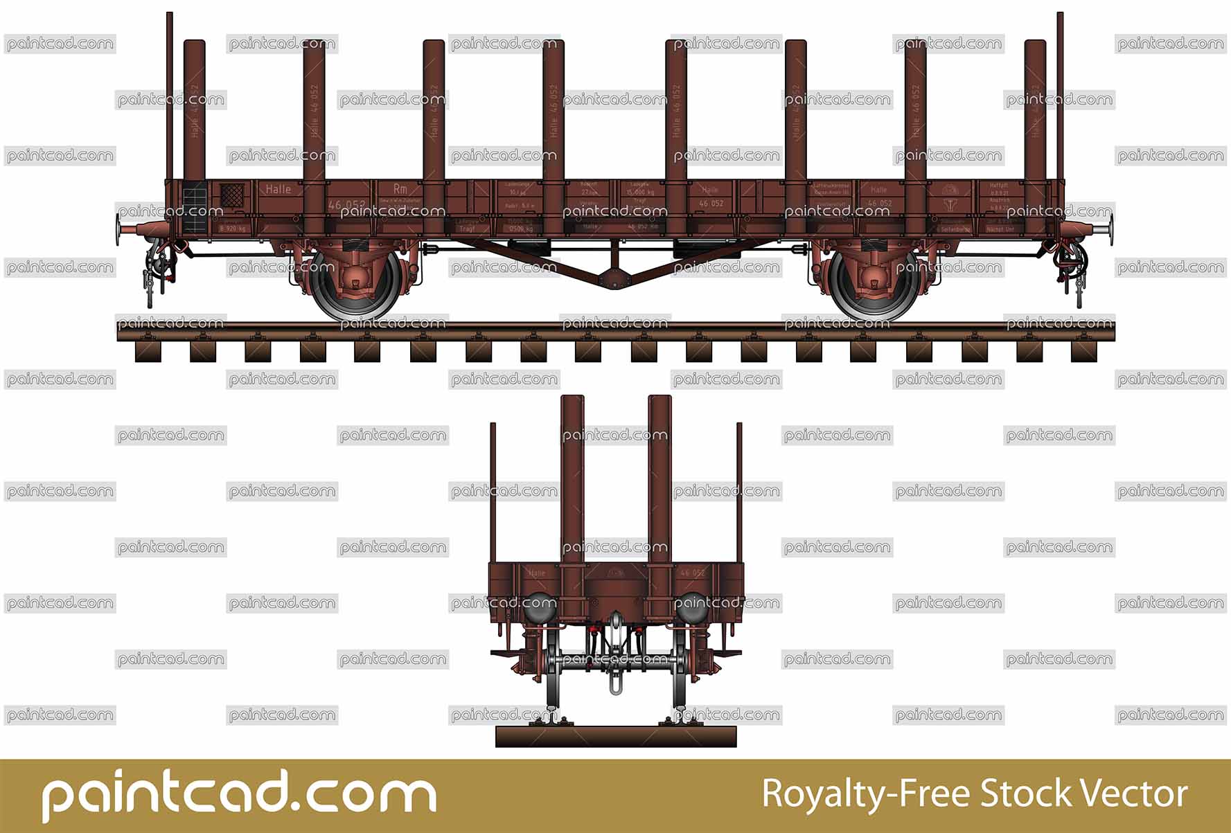 Side and front view of platform freight wagon manufactured in Kingdom of Saxony (1913-1927). Designed with large volume and wooden stanchions.