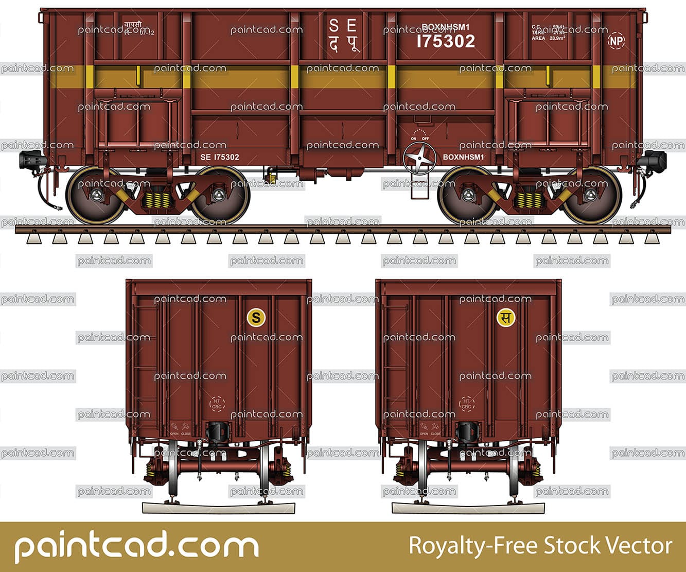 Side and front view with railroad gondola car for transport of coal, limestone and ore. Details- high-speed bogies CASNUB, CBC couplers, all technical inscriptions and designations. Reporting mark SE- South Eastern Railway Zone of the Indian Railways. EDITORIAL USE