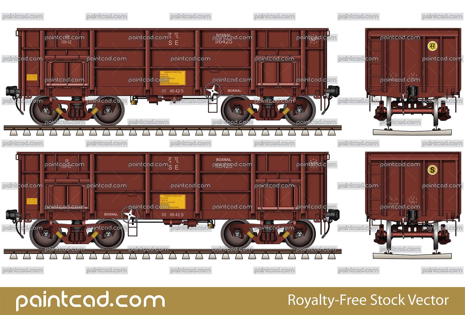 Side and front view with open-top wagon “BOXNAL” type. The car is fitted with a Casnub bogie air brake system. Side walls are provided with two flap doors for ease of unloading. Reporting mark SE- South Eastern Railway zone of Indian Railways. EDITORIAL USE