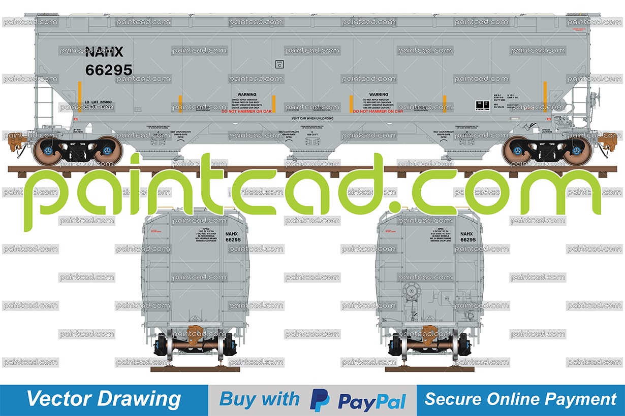 Hopper car with capacity 5200 cu ft for carriage of bulk cargo - sugar, grain, fertilizer, dry chemicals and other similar products. Side, front and back view with all technical parameters, instructions for safe handling and vertical hand brake. Reporting mark NAHX - General Electric Rail Service. EDITORIAL USE