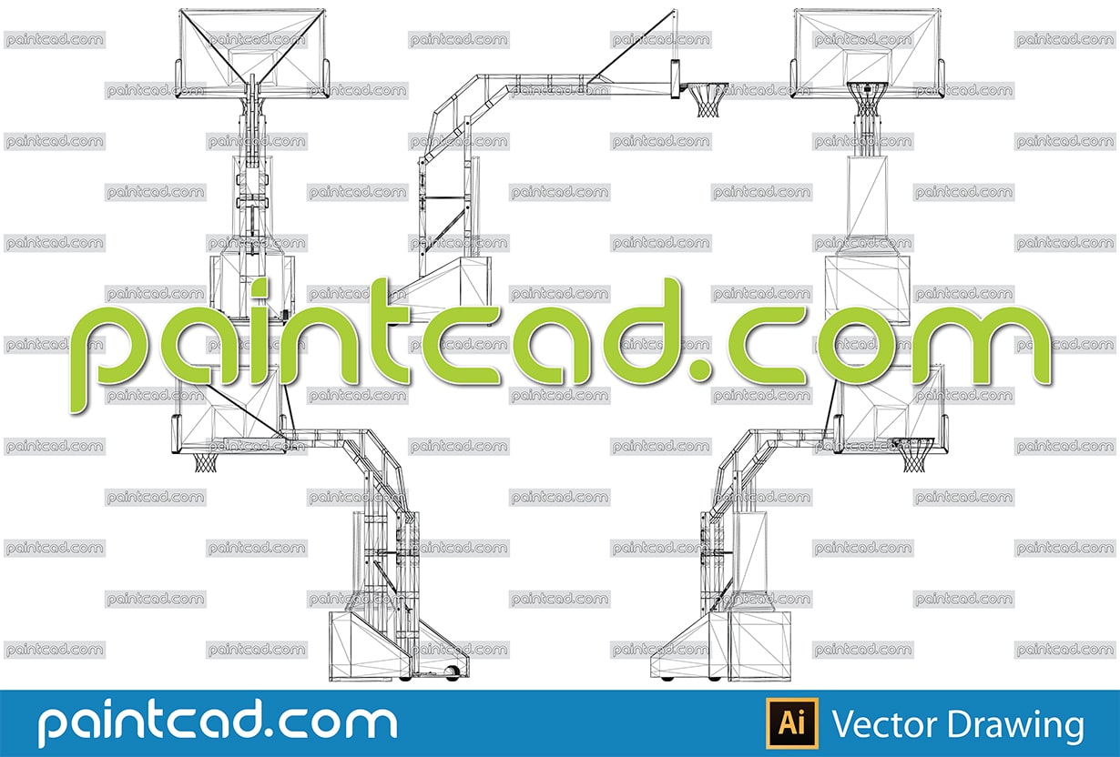 Vector illustration of portable basketball hoop on wheels. Side, front, back and axonometric views. Three-dimensional polygonal design. Isolated objects on white background.