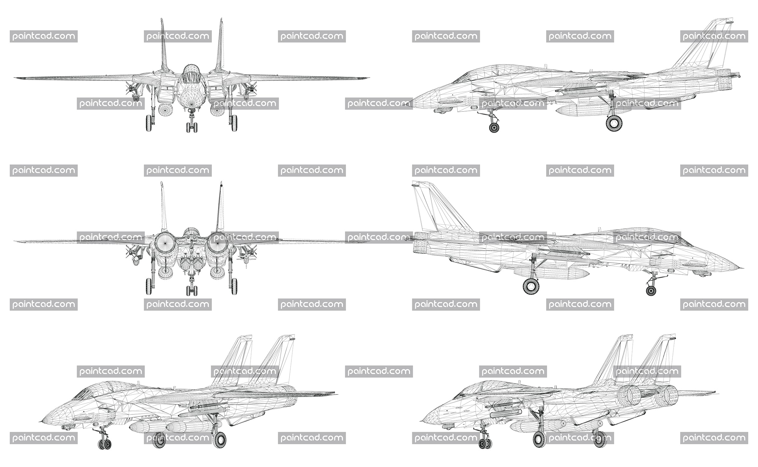 Vector drawing with wire model of contemporary military airplane. Side, front, back and axonometric view. Three-dimensional polygonal design. Transparent vector graphic.