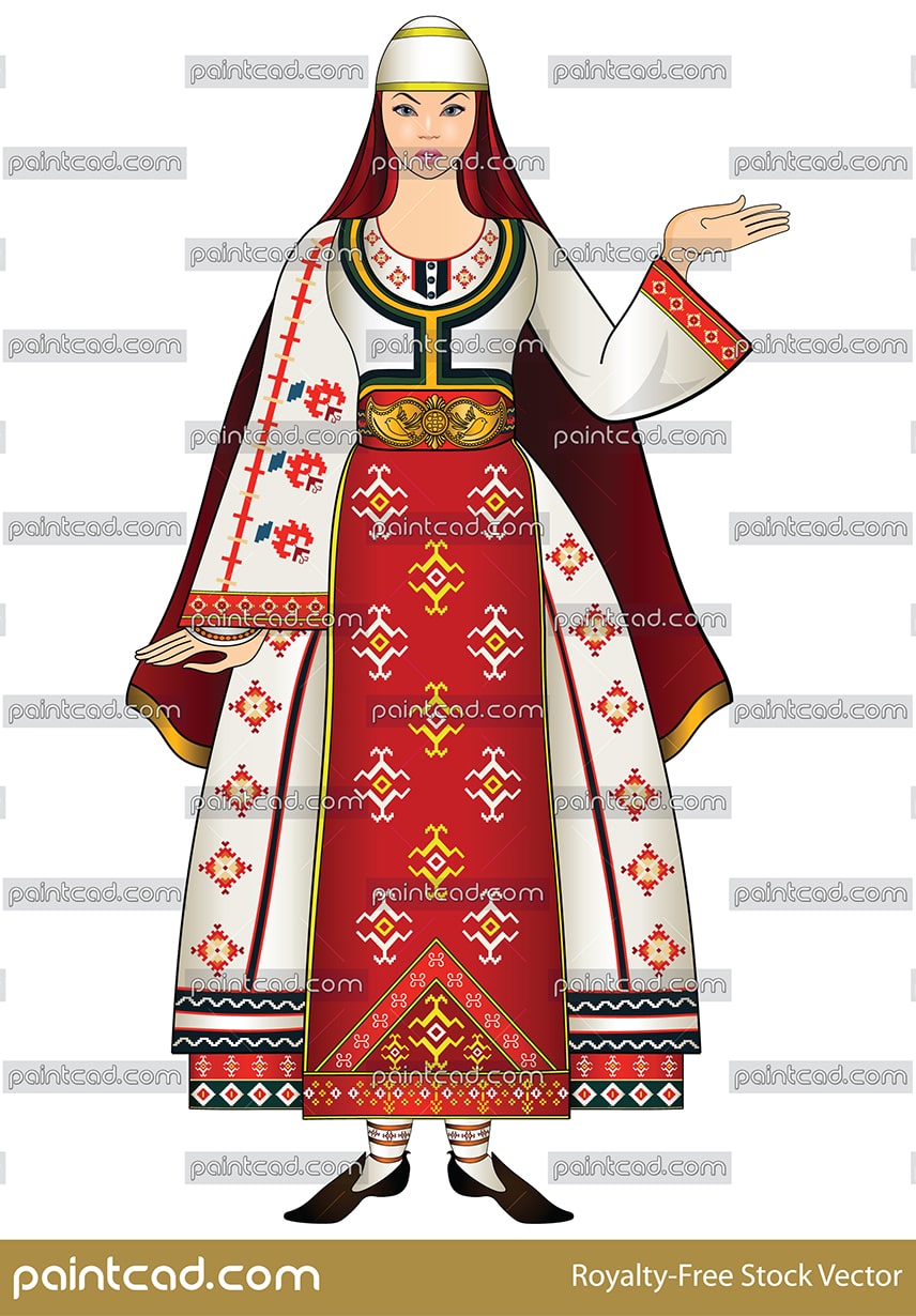 Young woman in traditional folk costume from Southwest Bulgaria. The region is known as Pirin Macedonia. Ethno motifs and classical Bulgarian embroidery.