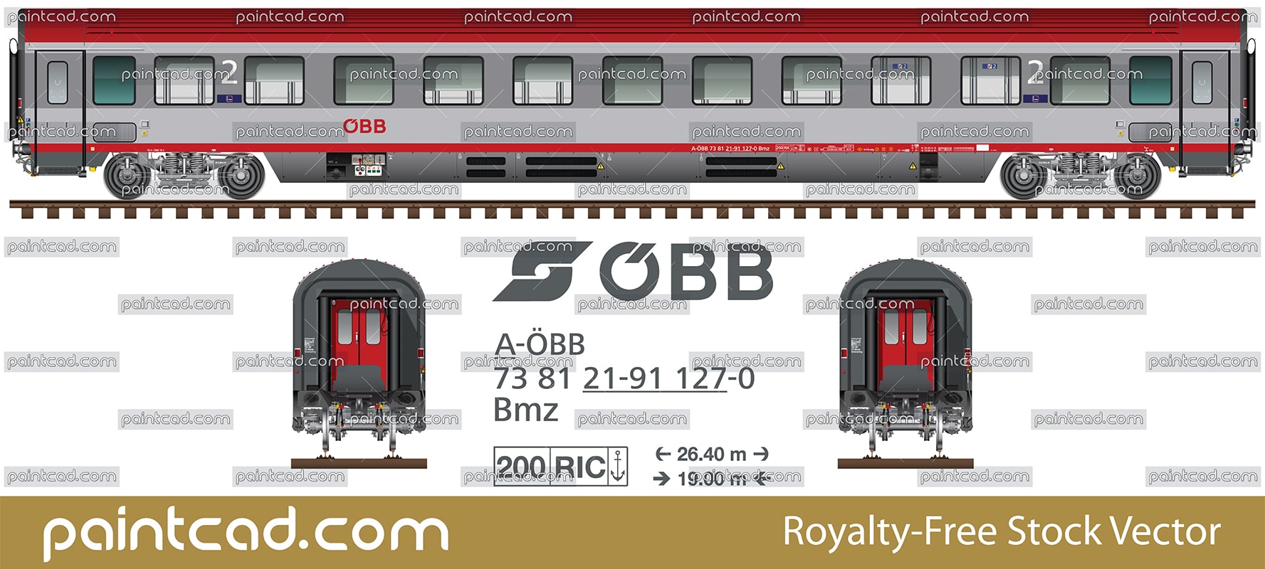 Side and front view with Austrian passenger wagon "Eurofima", ÖBB railway company. UIC classification Bmz: "B"- passenger car with 2nd class seats, "m"- four-axle longer than 24 meters, "z"- four-axles with power supply from a bus-bar. Rail car with stylish silver livery and red roof. EDITORIAL USE