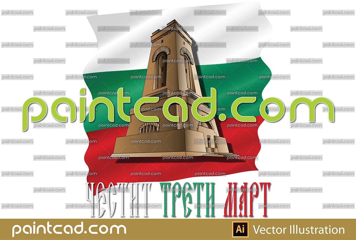 Memorial of Freedom Shipka over Bulgarian tricolor. Monument-tower erected in honor of the fallen heroes for the freedom of Bulgaria in the Russo-Turkish War 1877–1878. On the walls have inscriptions Sheinovo and Stara Zagora in Bulgarian. Celebration of March 3 - Bulgaria's National Holiday.