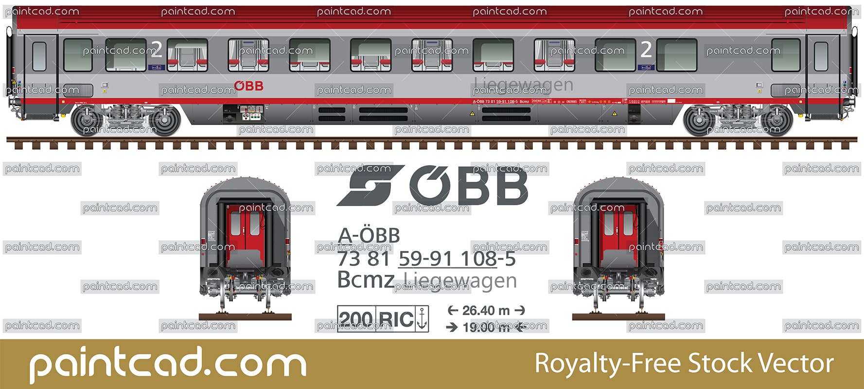 Side and front view with couchette car of the Österreichische Bundesbahnen-ÖBB. Eurofima wagon second class with compartments for seating and beds. Coach have a service compartment and 2 toilets. All technical inscriptions and markings are under UIC- The International Union of Railways. EDITORIAL USE