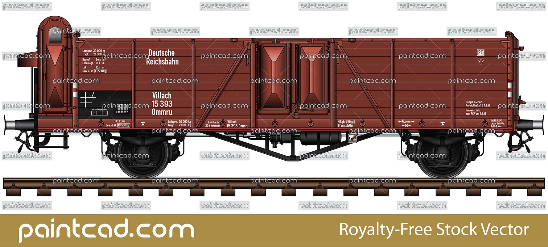 Side view with open-topped railway car manufactured in Germany from 1939 to 1945. Reporting mark DR - Deutsche Reichsbahn, Villach Ommru. The wagon have a brake cab for the brakeman of train. Details - railway track, all technical inscriptions and markings, air hoses, air-brake cylinder and others.