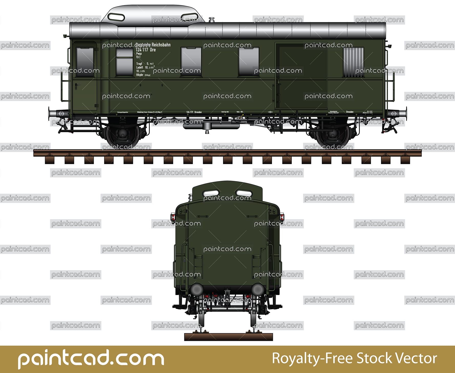 Side and front view with railway postal wagon type Pwgs 41 from the time of World War II between 1939-1945. Reporting mark DRB - Deutsche Reichsbahn, Dresden, Pwgs.