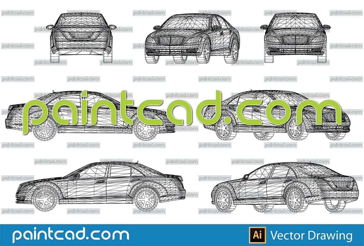 Vector drawing with wireframe design of luxury car - business class, sleek and aerodynamic design. Front, rear, side and axonometric view. Three-dimensional polygonal design. Isolated objects on white background.
