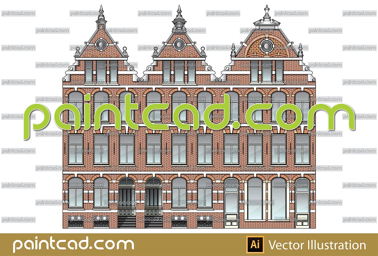 Vector illustration of classic high-rise houses from Amsterdam, Netherlands. Dutch city houses of the Renaissance epoch. The front walls of the buildings end with beautiful gables. Visible brickwork with shaped fugues, horizontal friezes and beautiful woodwork. Colored architectural drawing.