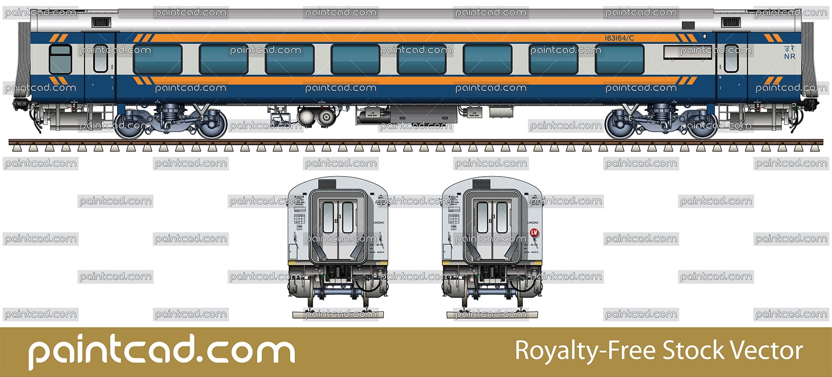 Side and front view of passenger Indian first class Air-conditioned chair car “Linke Hofmann Busch” in dark blue-silver livery and yellow stripes. This coach have a 56 seats. High-quality color graphic with many details and technical inscriptions in Hindi and English. EDITORIAL USE