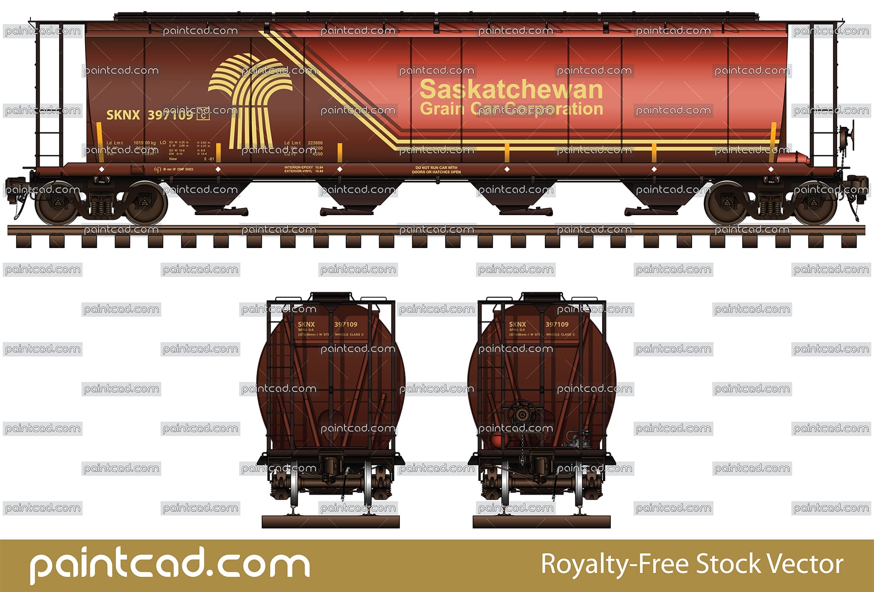 Side and front view of cylindrical railroad covered hopper car for carriage of grain cargo on long distances. Vector illustration with four container compartments with a narrow opening at bottom for unloading, logo, air brakes, shadows and all technical inscriptions in English. EDITORIAL USE