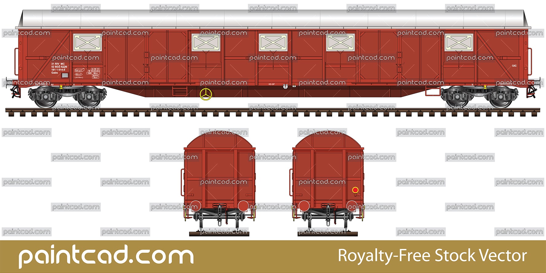 Side and front view of boxcar Gabs type with two loading doors on each side. Reporting mark BDZ - Bulgarian State Railways. Railroad van for transport of packed and bulk materials that were vulnerable by the weather. EDITORIAL USE