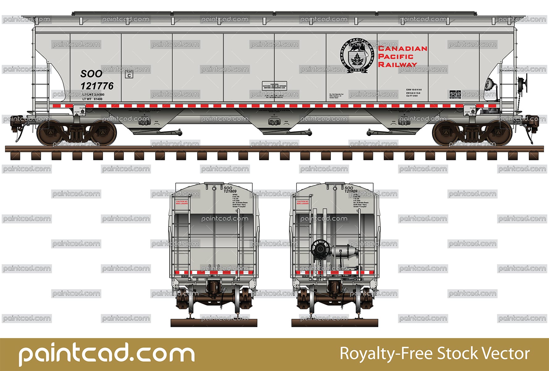 Side and front view of cylindrical covered hopper car by for carriage of grain cargo on long distances. Reporting mark SOO Pacific Railway - Soo Line Railroad. Details- all technical parameters, “beaver” black logo, inscriptions, instructions for safe handling and hand brake. EDITORIAL USE