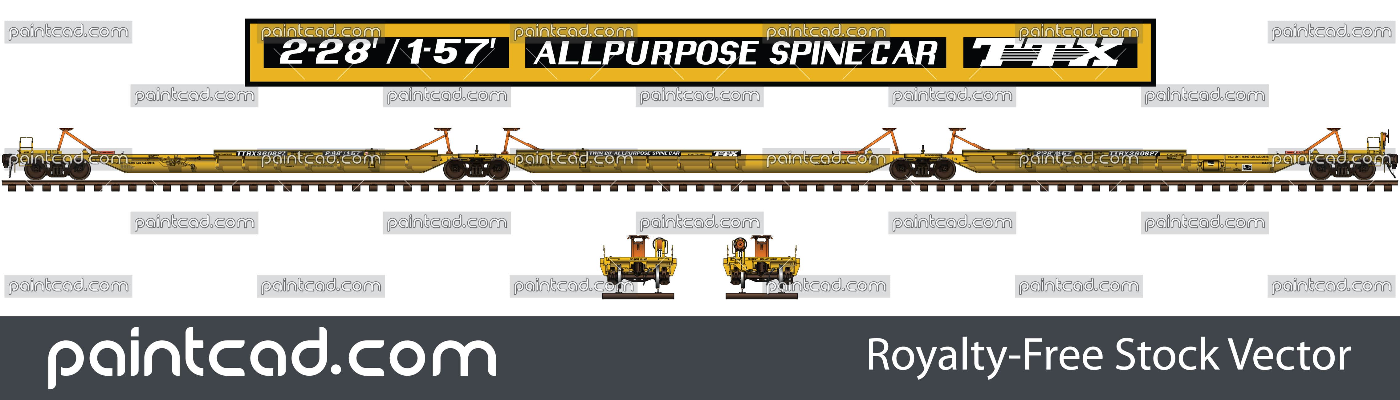 Side and front view with an articulated 3-platform railcar. Spine cars carry intermodal containers or trailers in single stack configuration. First prototype was put into operation in the 1990 years. Trinity built car and owned by TTX Company. High-quality color drawing. EDITORIAL USE
