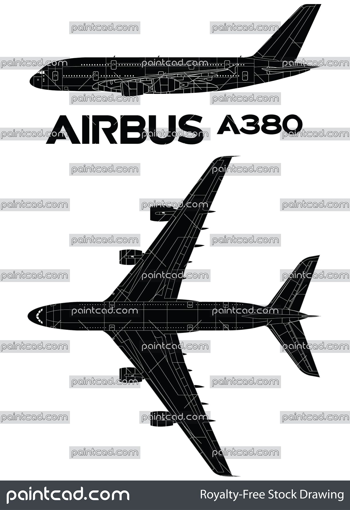 Scale vector drawing of double-deck and four-engine jet airliner Airbus. Side and top view. Detailed illustration suitable for infographic purposes and graphic design.